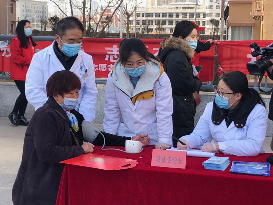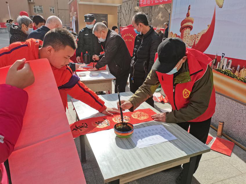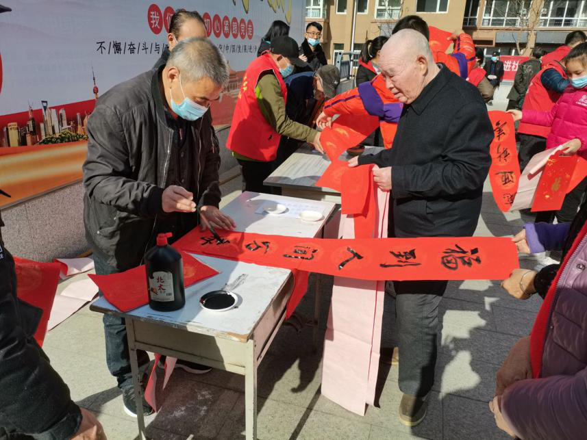 當(dāng)天,豐源居小區(qū)志愿者協(xié)同醫(yī)院職工和第一時(shí)間志愿者為不返鄉(xiāng)居民免費(fèi)理發(fā)、寫春聯(lián),并為居民提供了眼科、心內(nèi)科、甲乳科、彩超等免費(fèi)檢查。豐源居小區(qū)活動(dòng)廣場(chǎng)上,數(shù)名書法愛好者忙得不亦樂乎,揮毫潑墨,書寫春聯(lián);十余名志愿者幫忙整理對(duì)子,把書寫好的春聯(lián)一字排開,晾干后裝進(jìn)禮袋送給居民;4名理發(fā)師志愿者為老年人理發(fā);醫(yī)院人員為老年人測(cè)血壓?jiǎn)栐\,現(xiàn)場(chǎng)氣氛其樂融融。